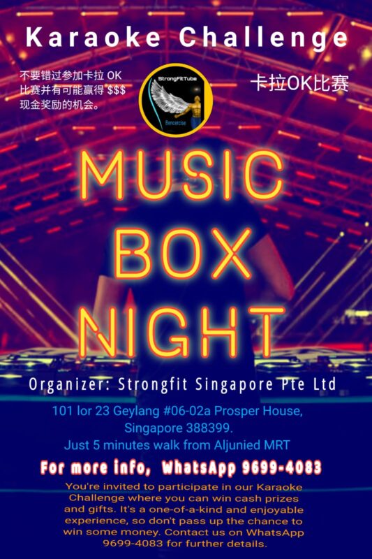 INTERNATIONAL ONLINE KARAOKE COMPETITION (Singapore - Worldwide) Join in on the fun and showcase your singing skills by submitting a video for our Online Karaoke Challenge. You could be the lucky winner of a prize! Individuals who take part in our Preliminary karaoke challenge will be eligible to enter our Semi Final /Grand Final Challenges and have the opportunity to win Cash prizes $$$. Our grand event will be held at a luxurious 5-star hotel. To register, simply pay S$29 via Paylah/ paynow to 96994083, or transfer money to Strongfit Singapore Pte Ltd UEN: 201915586R, DBS Bank Account 2019000525. Don't miss out on the chance to win the preliminary prize of S$500!